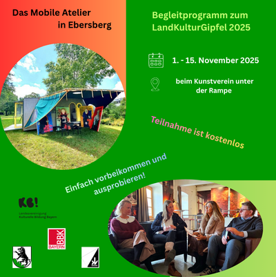 Das Mobile Atelier bringt Künstlerinnen und Künstler aus dem In- und Ausland mit der bayerischen Bevölkerung zusammen. Es wirft Schlaglichter auf die - häufig unterschätzte - freie Szene im ländlichen Raum und zeigt die Vielfalt der Kulturlandschaft Bayerns. In den ersten beiden Novemberwochen werden kostenfreie Workshops für Kinder und Jugendliche sowie ein offenes kostenfreies Kulturprogramm für Erwachsene angeboten. Unter dem Motto "Gestalt dir deinen Ort!" nimmt die Künstlerin Coline Eberhard die Teilnehmenden mit auf eine kreative Reise durch Ebersberg und die Region. Hier darf man sich ausprobieren, mitgestalten und der Umgebung ein Stück Kreativität schenken. Am 9. November 2025 um 18.30 Uhr werden Werke der Künstlerin und Ergebnisse aus den Workshops in einer Vernissage im Studio an der Rampe ausgestellt. Die Veranstaltung steht unter der Schirmherrschaft von Bürgermeister Ulrich Proske. Besucherinnen und Besucher dürfen sich auch auf eine Lesung mit Norbert Niemann und ein anschließendes Künstlergespräch freuen. Die Teilnahme ist kostenfrei.