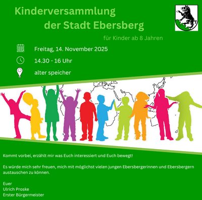 Ich freue mich deshalb sehr, Euch im Namen unseres ersten Bürgermeisters, Ulrich Proske, zur dritten Ebersberger Kinderversammlung einzuladen und zwar am